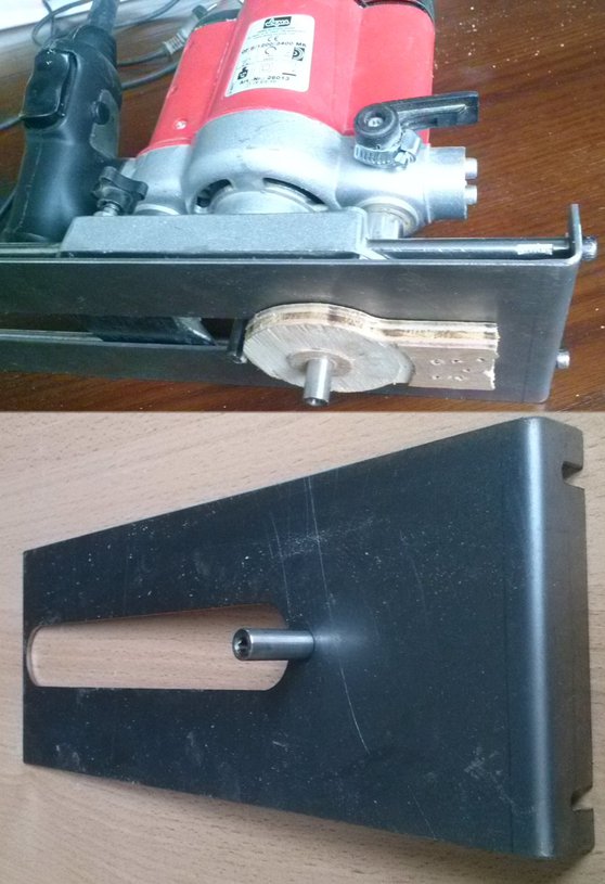 Mit der Auskreisvorrichtung lassen sich in Verbindung mit einer Oberfräse millimeter bis zehntelmillimeter genaue, kreis- u kurvenförmige Öffnungen, Teile, Scheiben usw. herstellen. Zur Herstellung von Teilen ohne Führungszapfenbohrung wird ein entsprechendes, maßhaltiges Muster gefertigt, dieses dient zur Führung eines Bündigfräsers. Die Vorrichtung bietet gegenüber bisher bekannten Vorrichtungen folgende Vorteile: